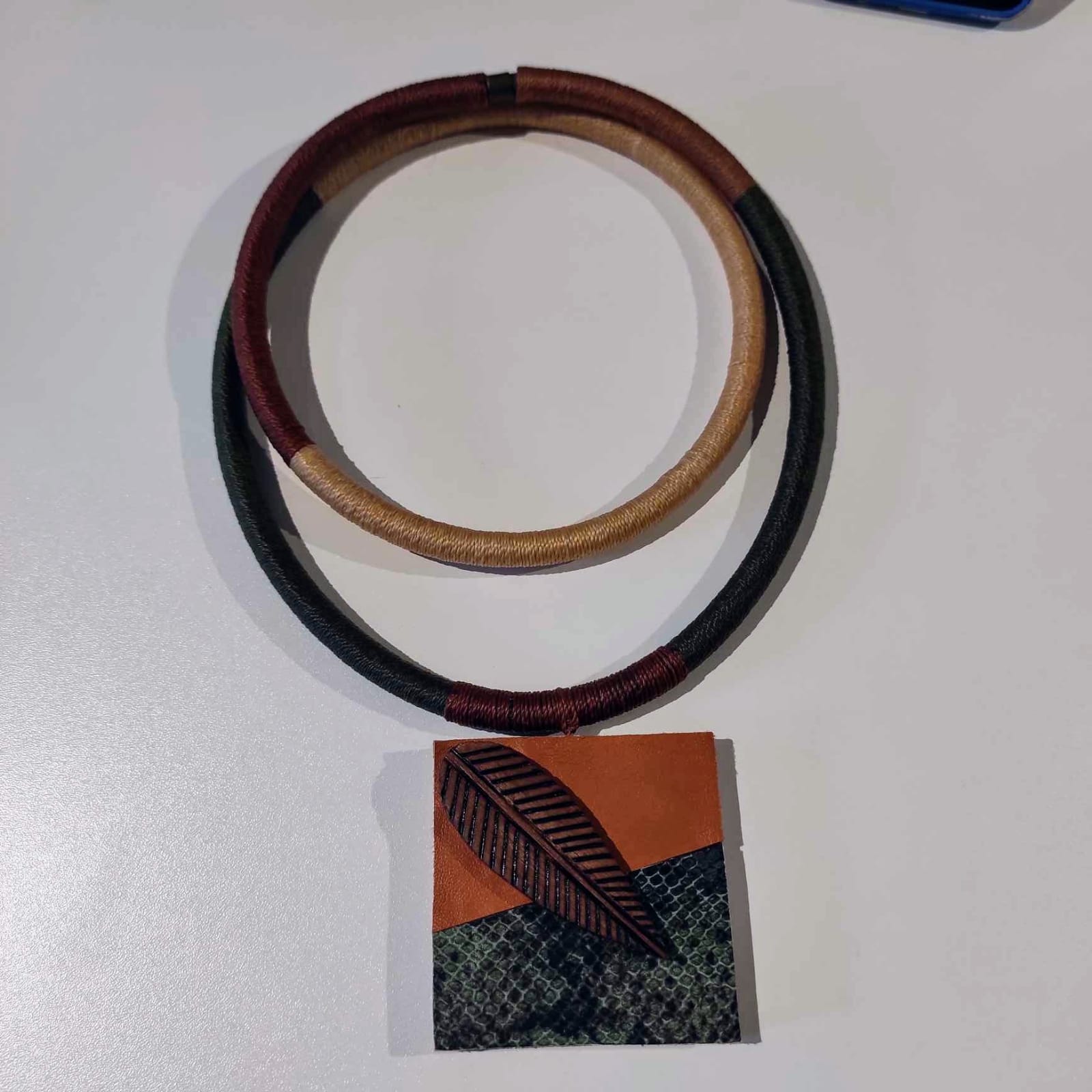 Colar Satere Mawe Mangueirinha Verde Marrom e Bege Pingrntr Madeira e Folha